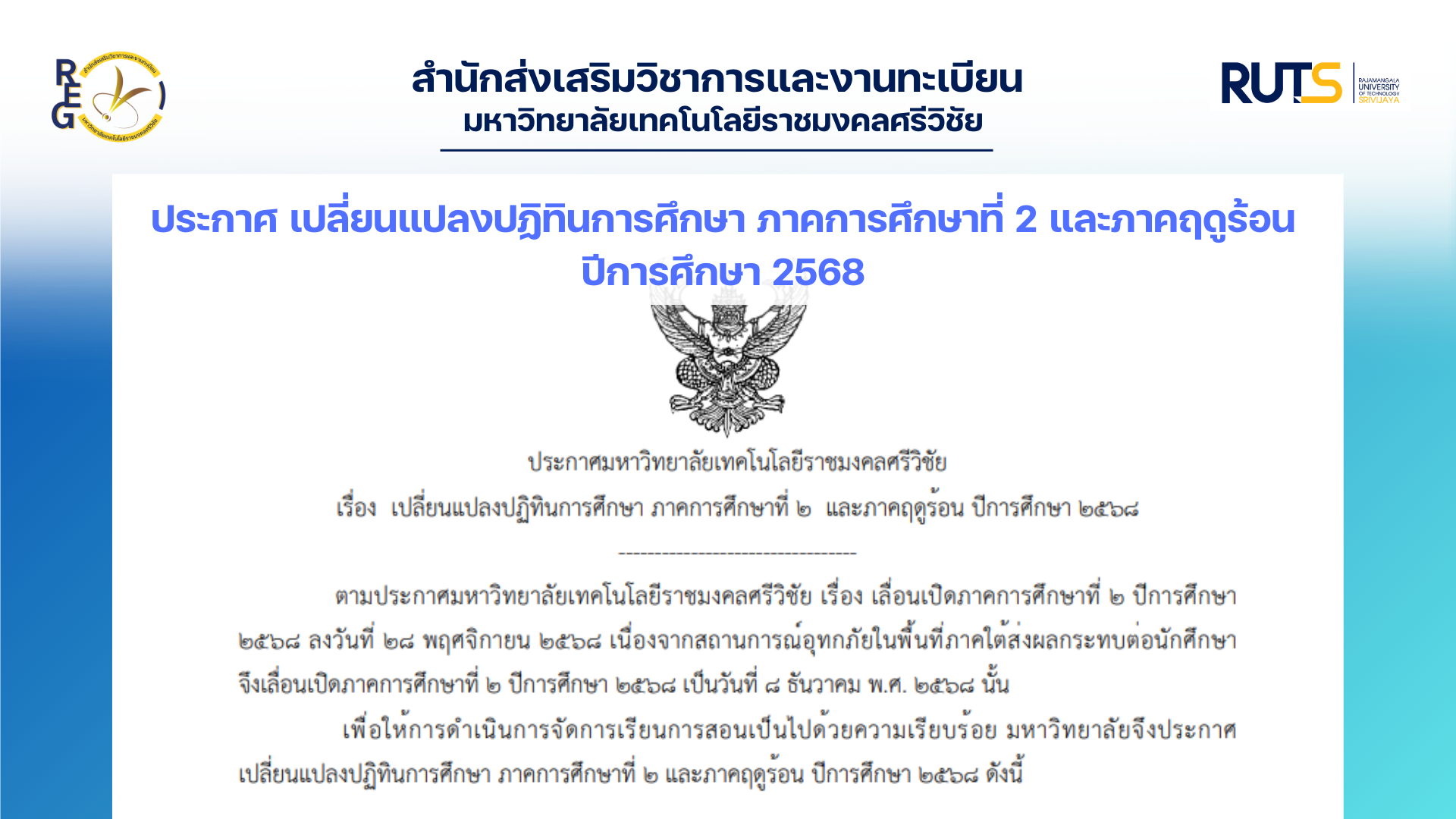 นักศึกษา ประกาศงดการเรียนการสอน เนื่องด้วยการฝึกซ้อมย่อย พิธีพระราชทานปริญญาบัตร ประจำปีการศึกษา 2567กันยายน 2, 2025กันยายน 2, 2025